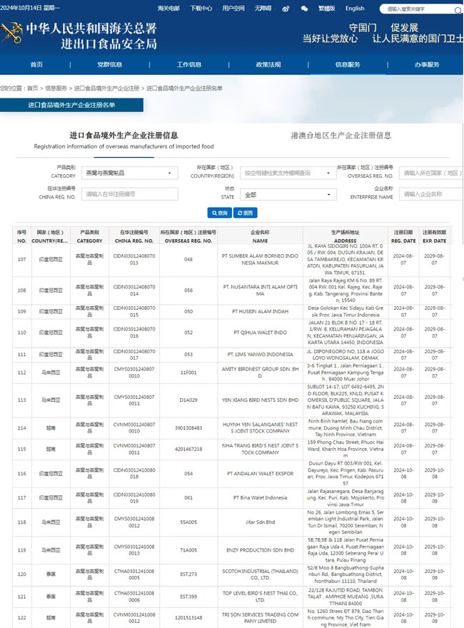 根据海关总署公布的进口食品境外生产企业注册名单,截至目前新增加16家燕窝生产企业,分别为印度尼西亚7家、马来西亚4家、越南3家、泰国2家。获华注册的燕窝生产企业总数增至122家,马来西亚、印度尼西亚、越南、泰国燕窝生产企业分别为54家、48家、12家、8家。